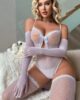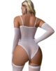 Conjunto de lencería tipo bodystocking en color blanco, diseñado para ofrecer una combinación perfecta de elegancia y sensualidad. Elaborado en malla fina semitransparente con textura delicada, se ajusta al cuerpo resaltando la silueta de forma favorecedora.