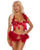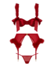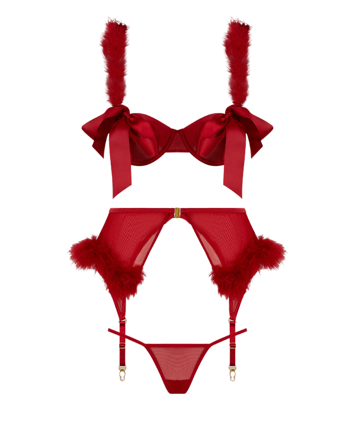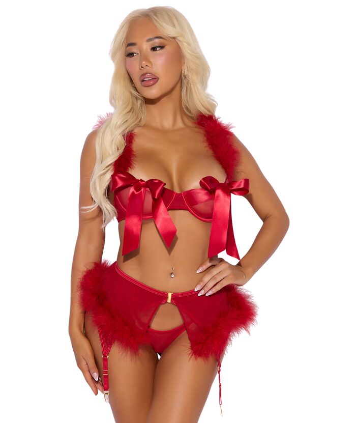 Este tentador trío combina el glamour del Hollywood clásico con un toque divertido. El sujetador con ribete de satén presenta copas transparentes que se atan con lazos de satén y tirantes de marabú, mientras que la falda con liguero y una vaporosa capa de malla está adornada con un ribete de marabú. El cierre desmontable y los tirantes ajustables de la falda añaden un toque de sensualidad, a la perfección con un atrevido tanga de malla. ¿Lista para ser la atracción principal?