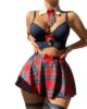 El conjunto incluye una falda corta de corte plisado con estampado a cuadros en tonos rojos y negros, que aporta movimiento y un look juvenil característico. Se complementa con medias tipo red con liguero, que añaden un aire sofisticado y llamativo al outfit.