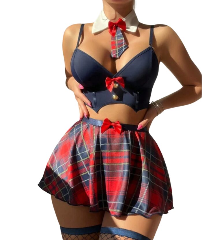 Disfraz de colegiala de estilo clásico con un toque moderno y atrevido, ideal para fiestas temáticas, cosplay o eventos especiales.